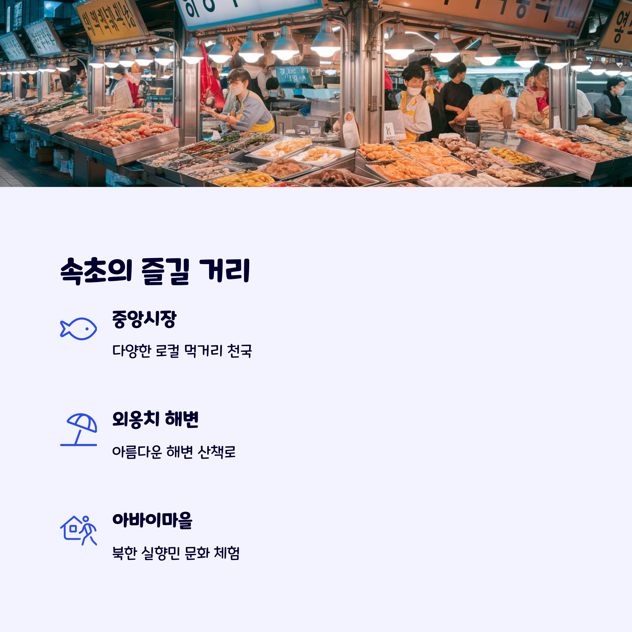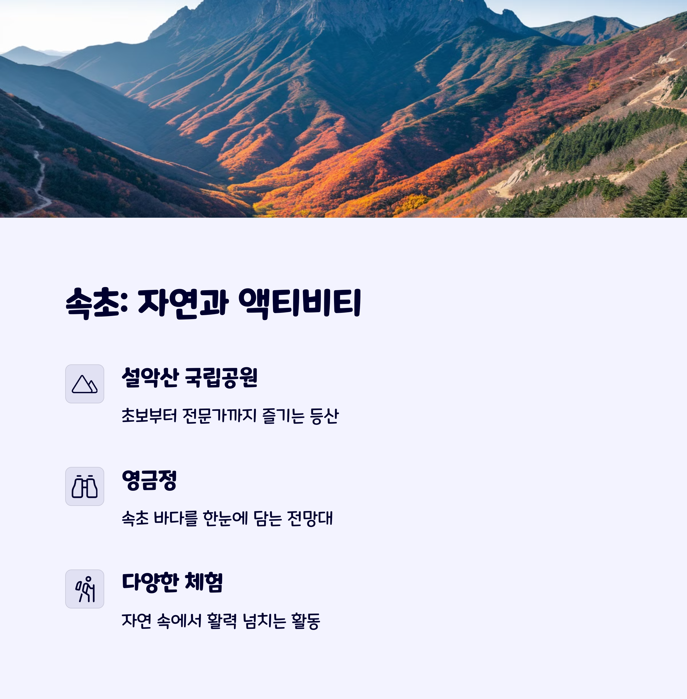 | 속초 특징 | 설악산, 바다, 맛집 탐방, 액티브한 여행 |