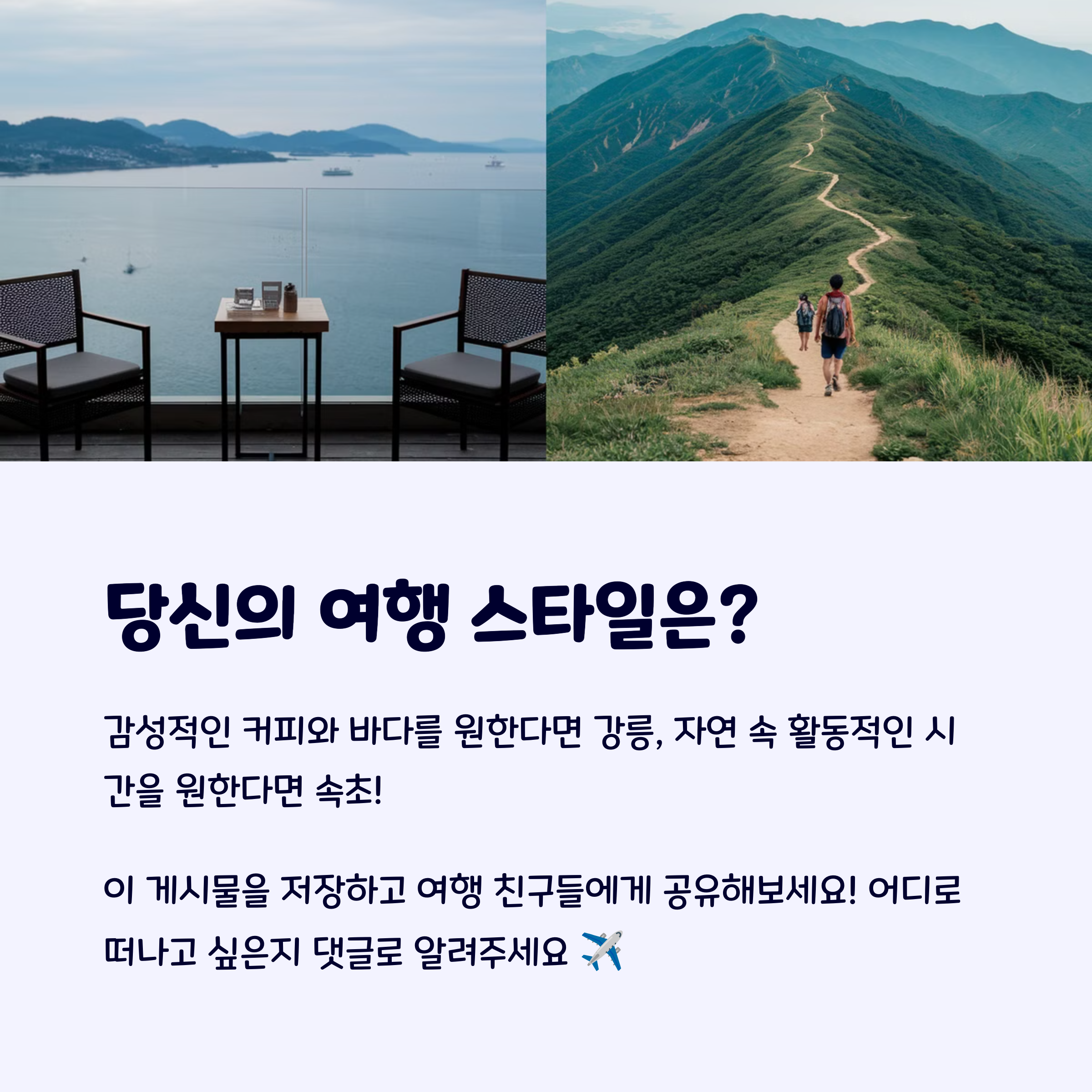 - 조용하고 감성적인 여행 ➝ 강릉 추천 🌊 - 자연과 맛집 탐방, 액티브한 여행 ➝ 속초 추천 🏞 여행 스타일에 따라 선택해 보세요! 😊