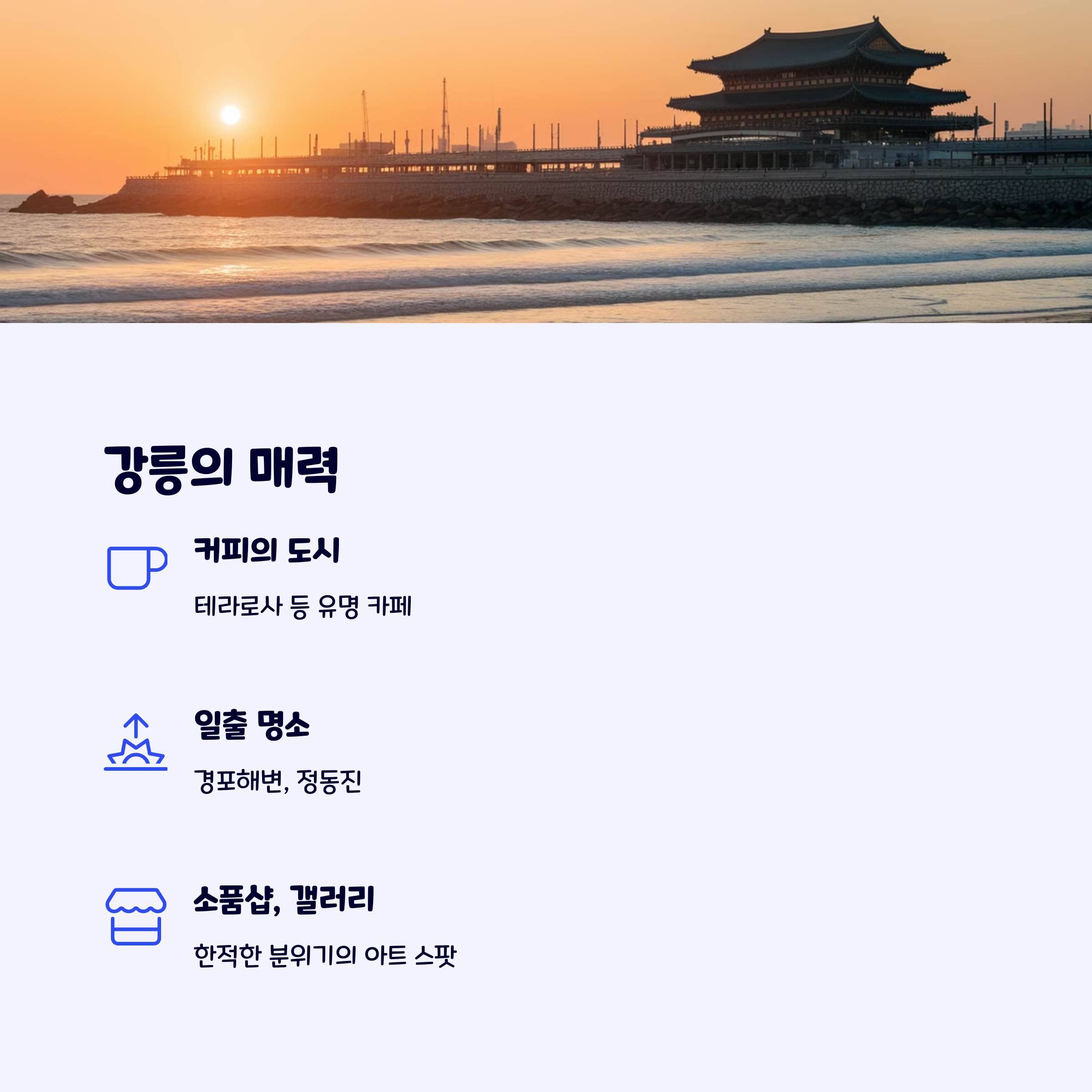 | 강릉 특징 | 감성적인 카페, 바다 풍경, 조용한 여행지 |