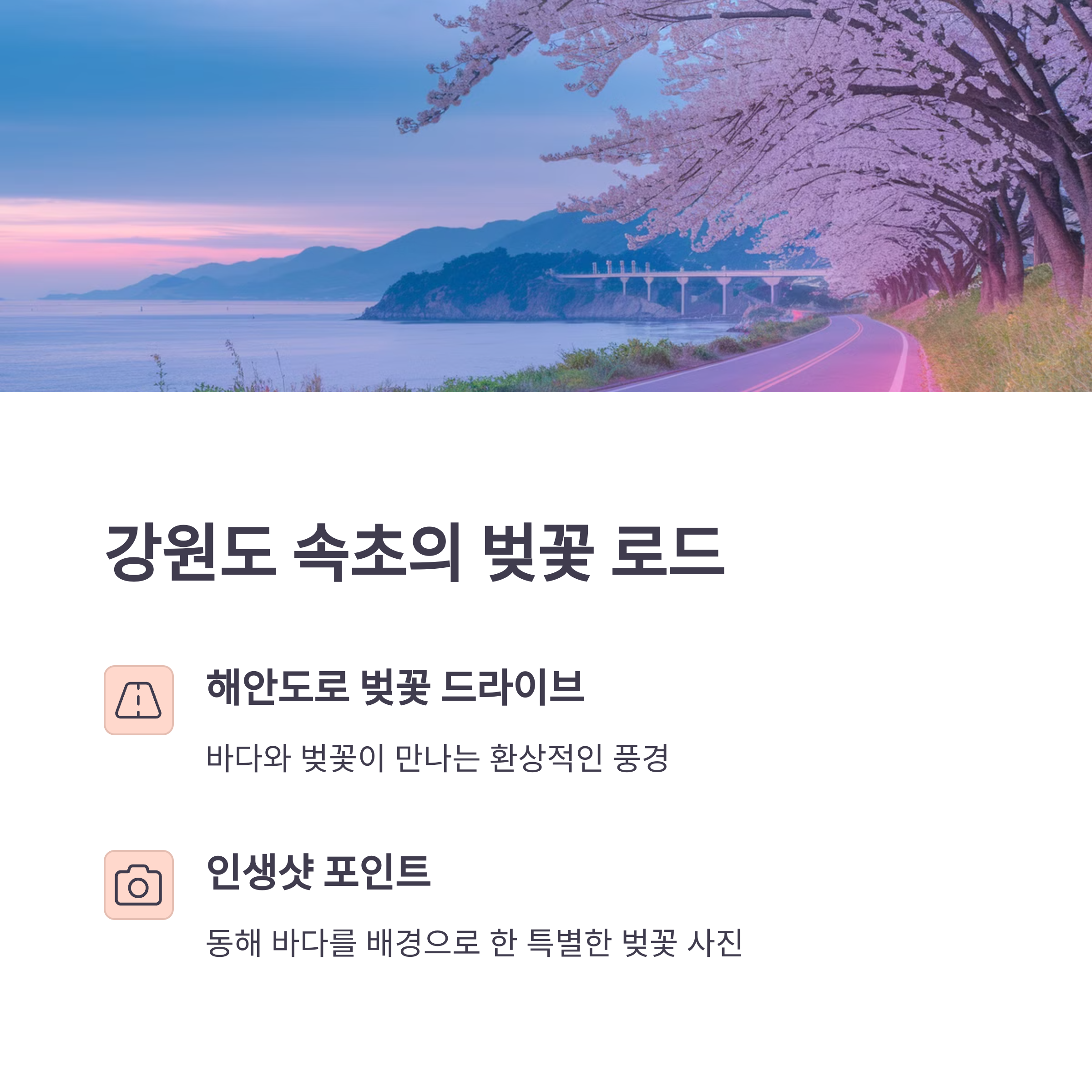 | 강원도 속초 | 4월 초 | 바다와 함께 즐기는 벚꽃 풍경 |