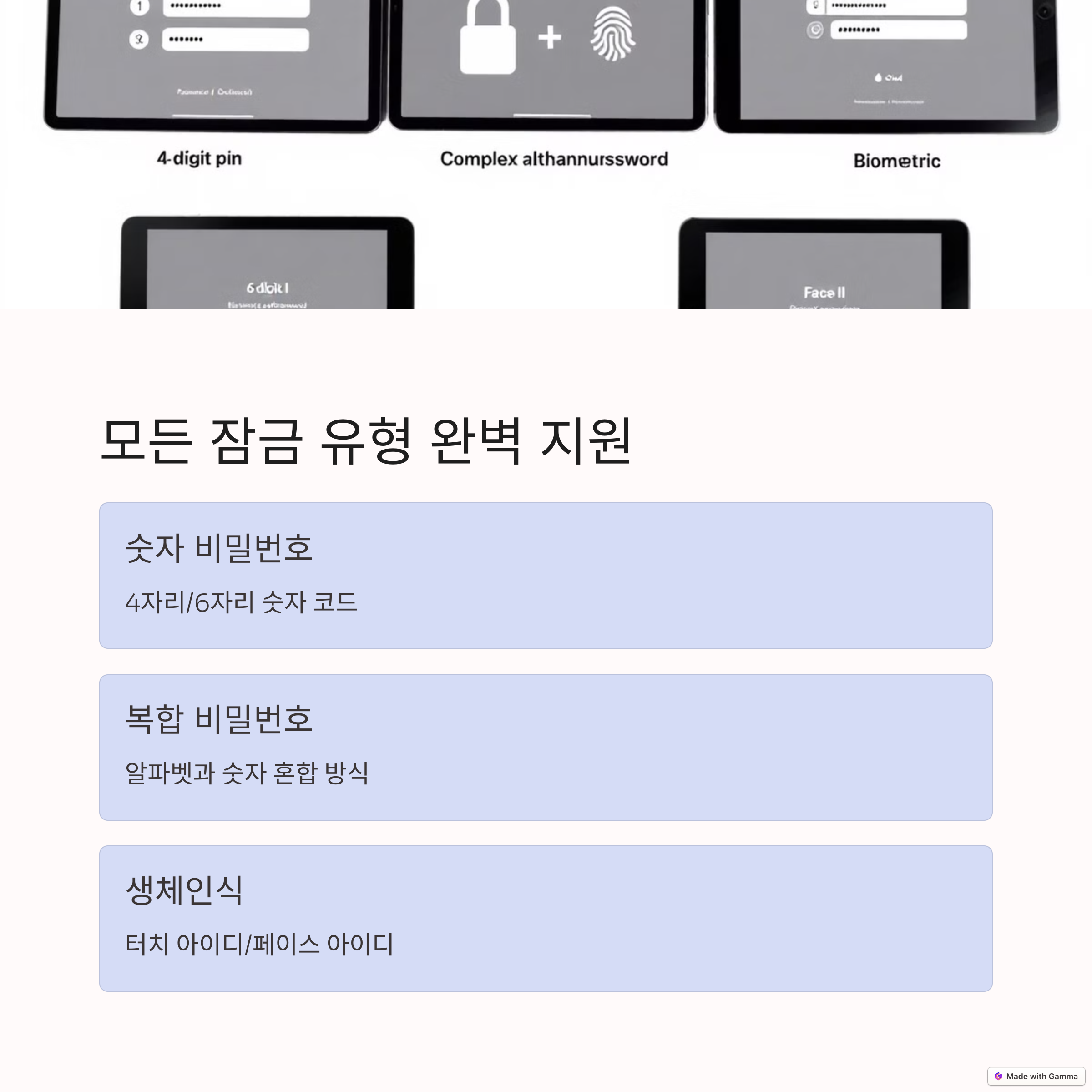 | 지원하는 잠금 유형 | 숫자 비밀번호, 터치 아이디, 페이스 아이디 모두 지원 |