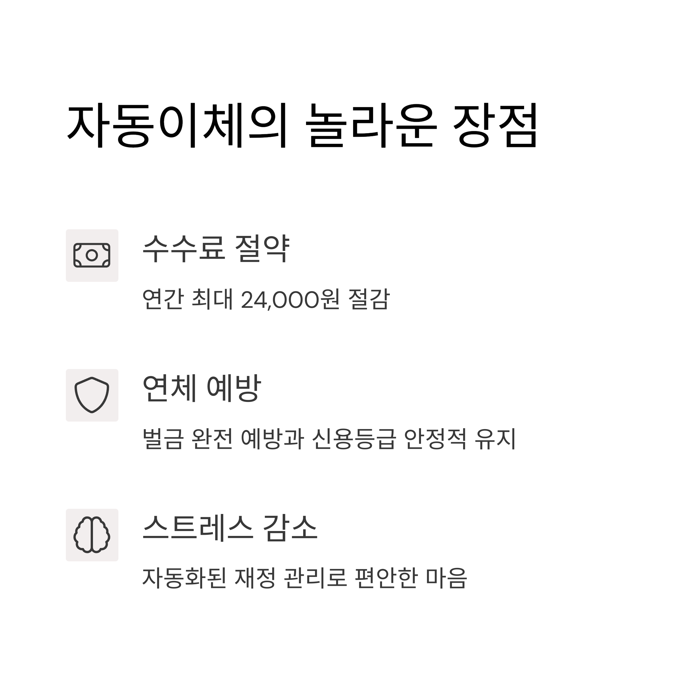 | 자동이체 장점 | 수수료 절약과 연체 방지가 가능합니다. |