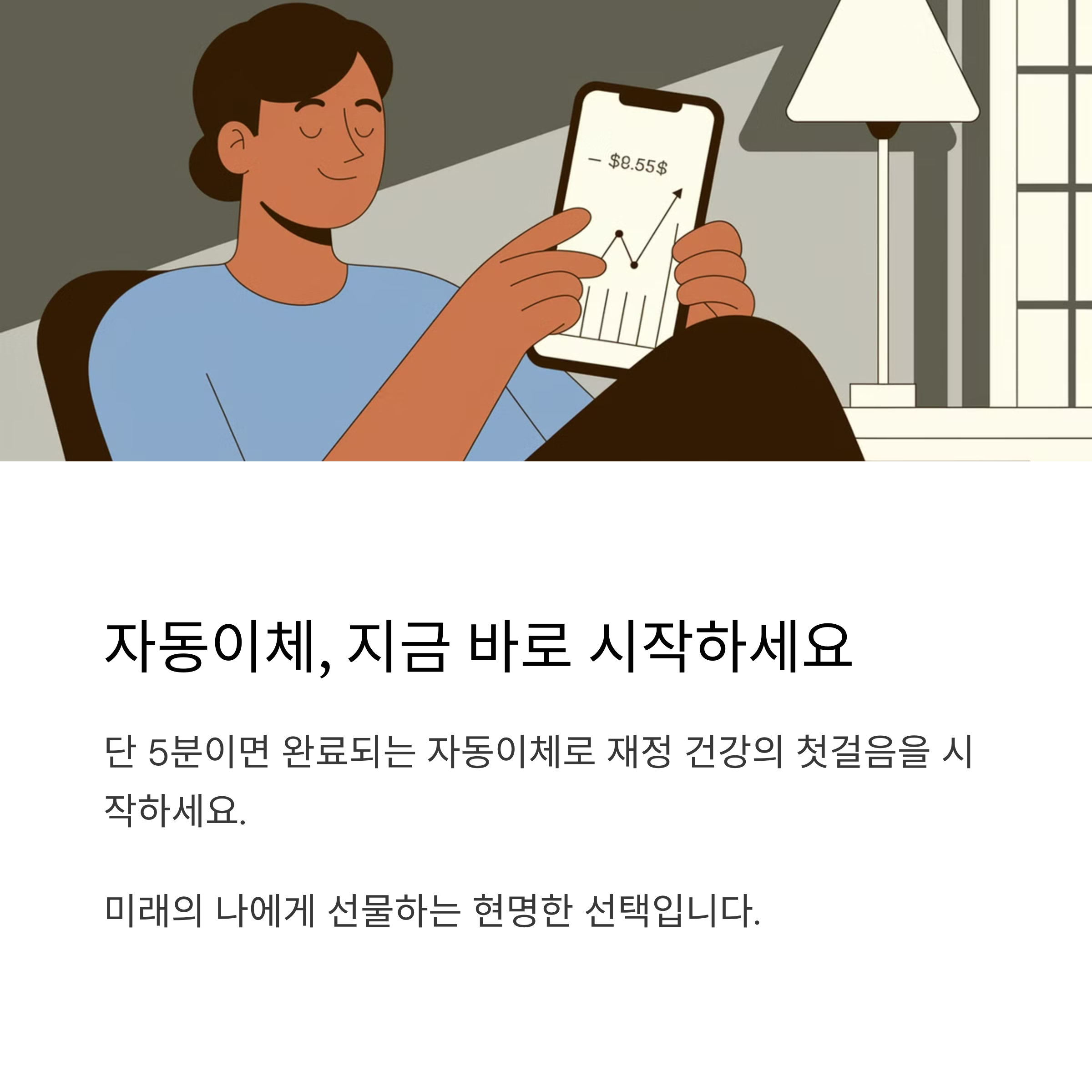 자동이체는 ‘편리함’ 그 이상의 가치를 제공합니다. 복잡한 금융 스케줄을 간단하게 정리하고 잊을 수 있는 납부를 대신해 주는 고마운 시스템이죠. 특히 자동이체는 반복되는 지출과 저축 패턴을 만들어주어 자산을 자연스럽게 축적하는 기반이 됩니다. 처음에는 어려울 수 있지만, 작은 실천이 쌓이면 놀라운 재정적 성취를 이뤄낼 수 있습니다. 오늘부터라도 한 항목만 자동이체로 바꿔보세요. 그리고 그 변화가 주는 편안함과 관리의 기쁨을 직접 체험해보시길 바랍니다.