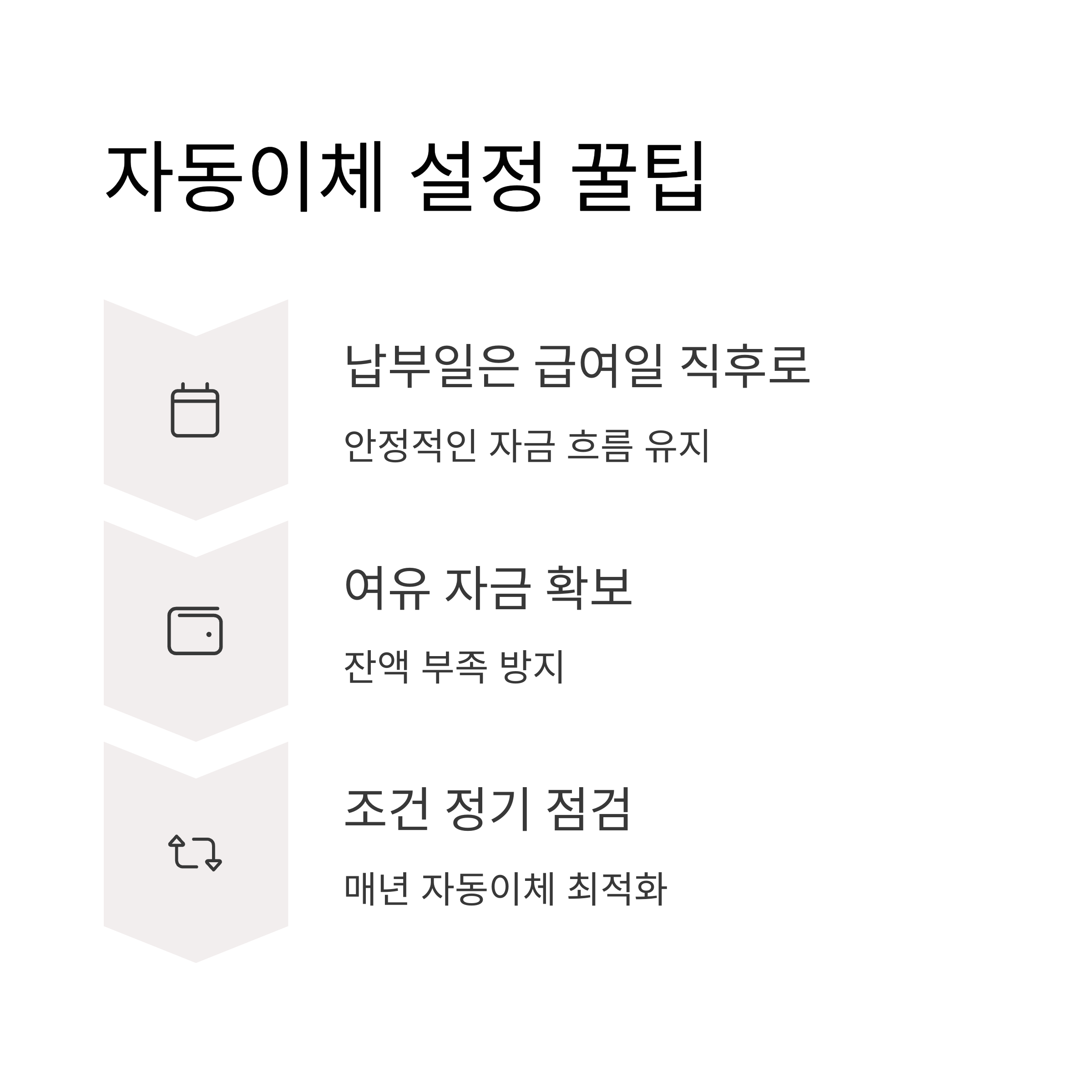 | 공과금, 카드 대금, 적금, 투자금 등 | 급여일 다음날 설정이 가장 이상적입니다. | 소액부터 시작하고 잔액 관리를 병행하세요. |