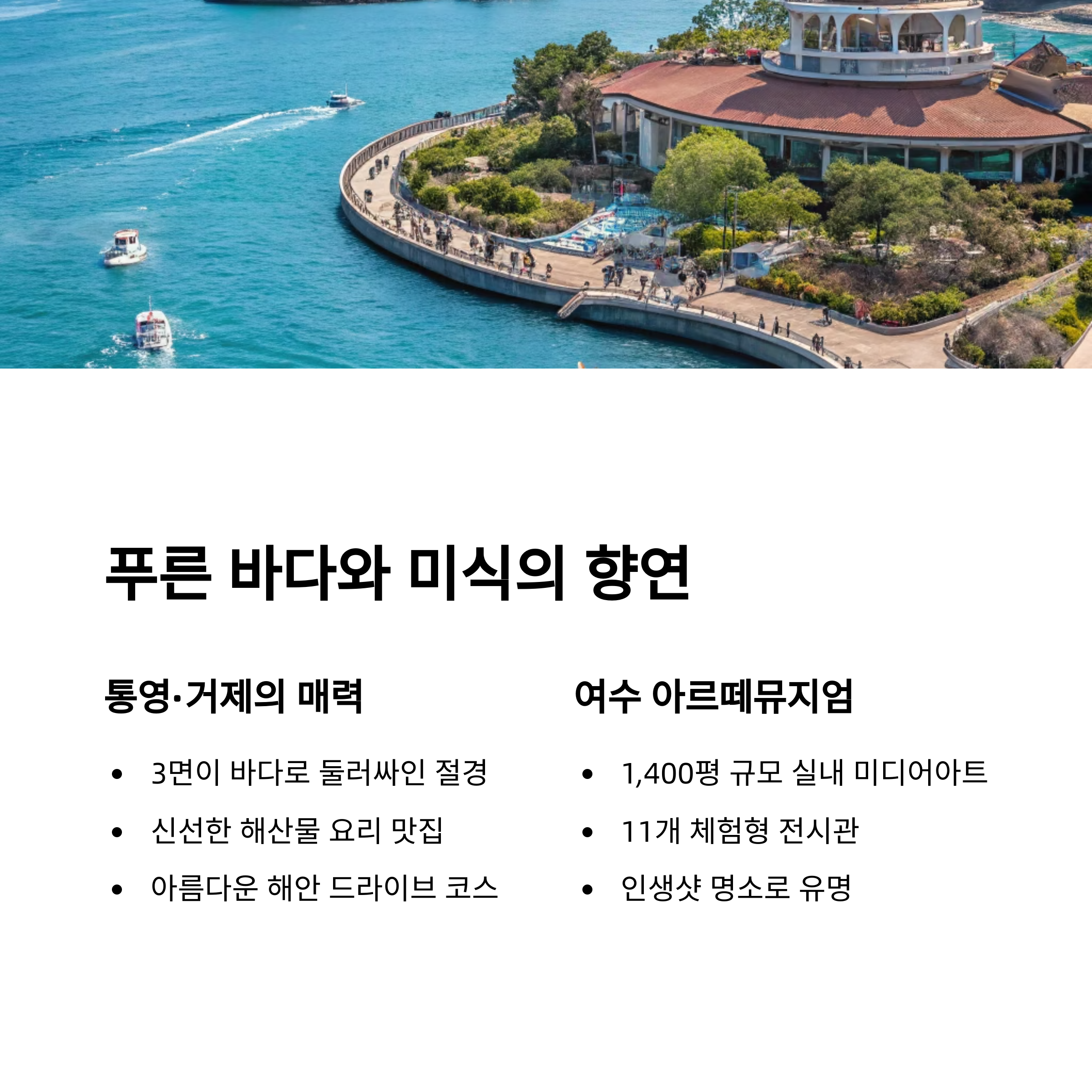 통영은 활어시장과 동피랑 벽화마을로 유명하고, 거제는 해금강과 외도 보타니아, 바다 케이블카로 인기가 높습니다.