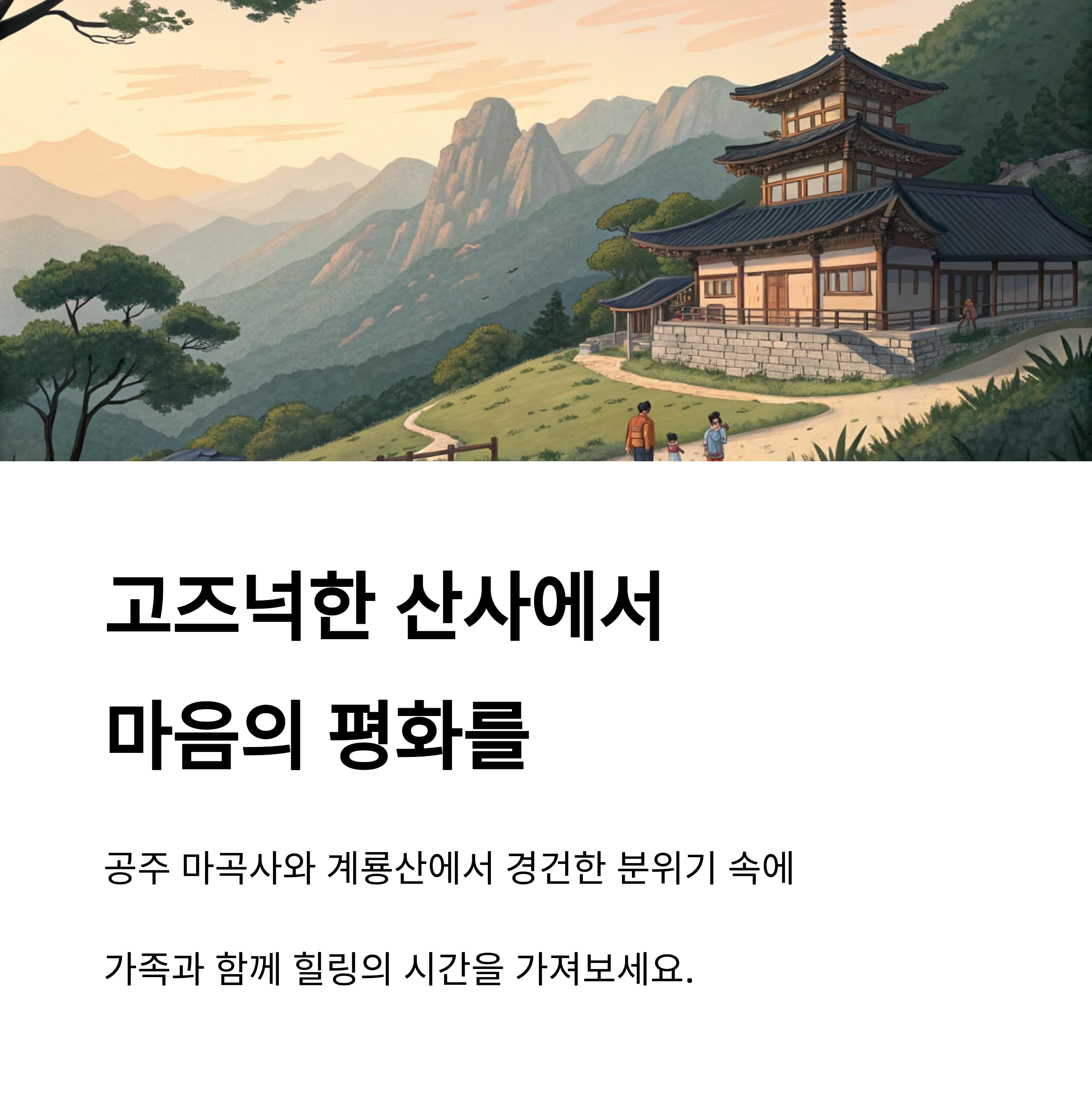 계룡산 자락에 자리한 이곳은 걷기 좋은 산책로가 많아 가족이 함께 조용한 시간을 보내기에 알맞습니다.