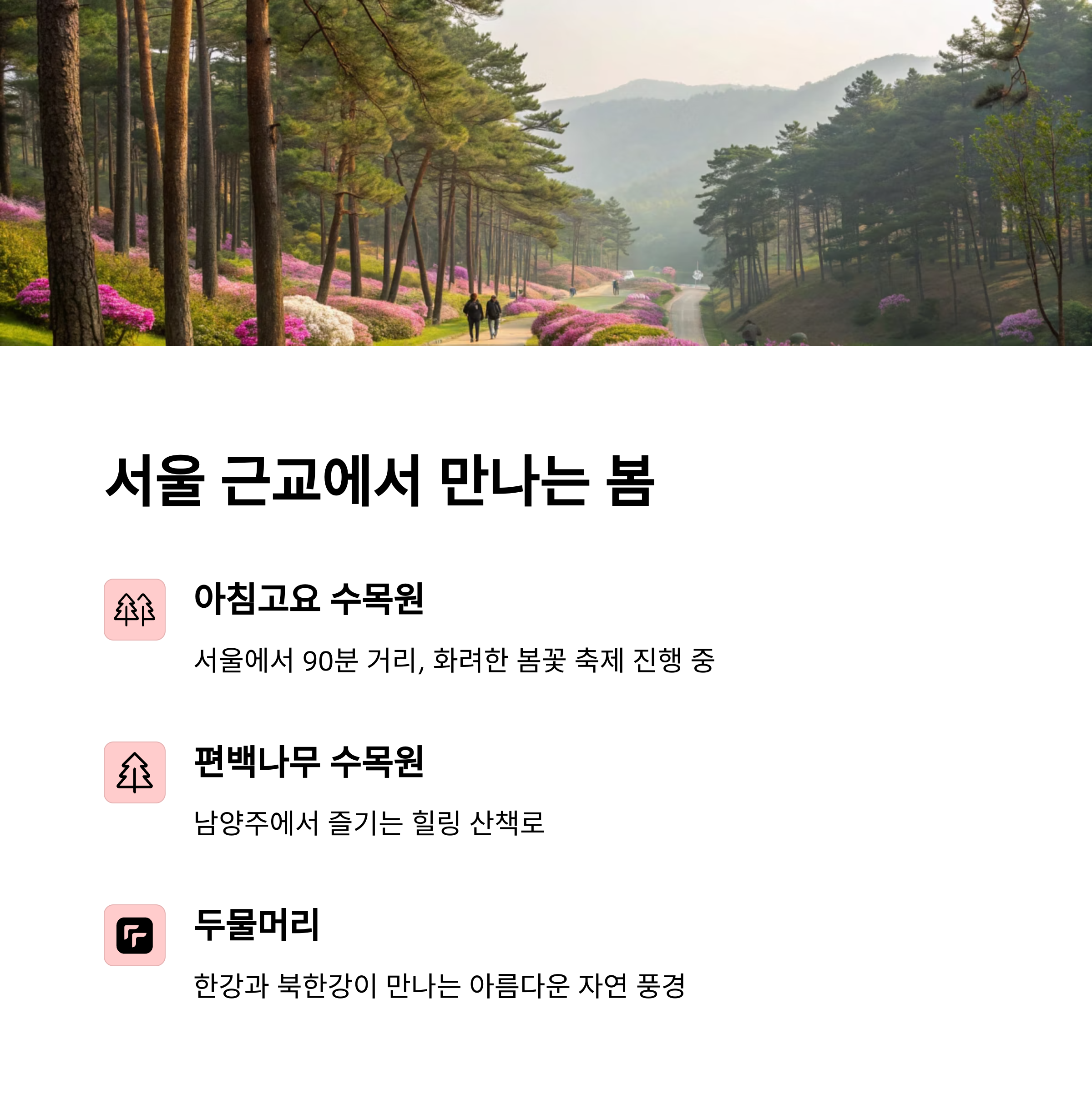 특히 봄꽃이 만개한 남양주 수목원과 한강 풍경이 아름다운 두물머리는 가볍게 산책하며 힐링하기 좋은 곳으로 인기입니다.