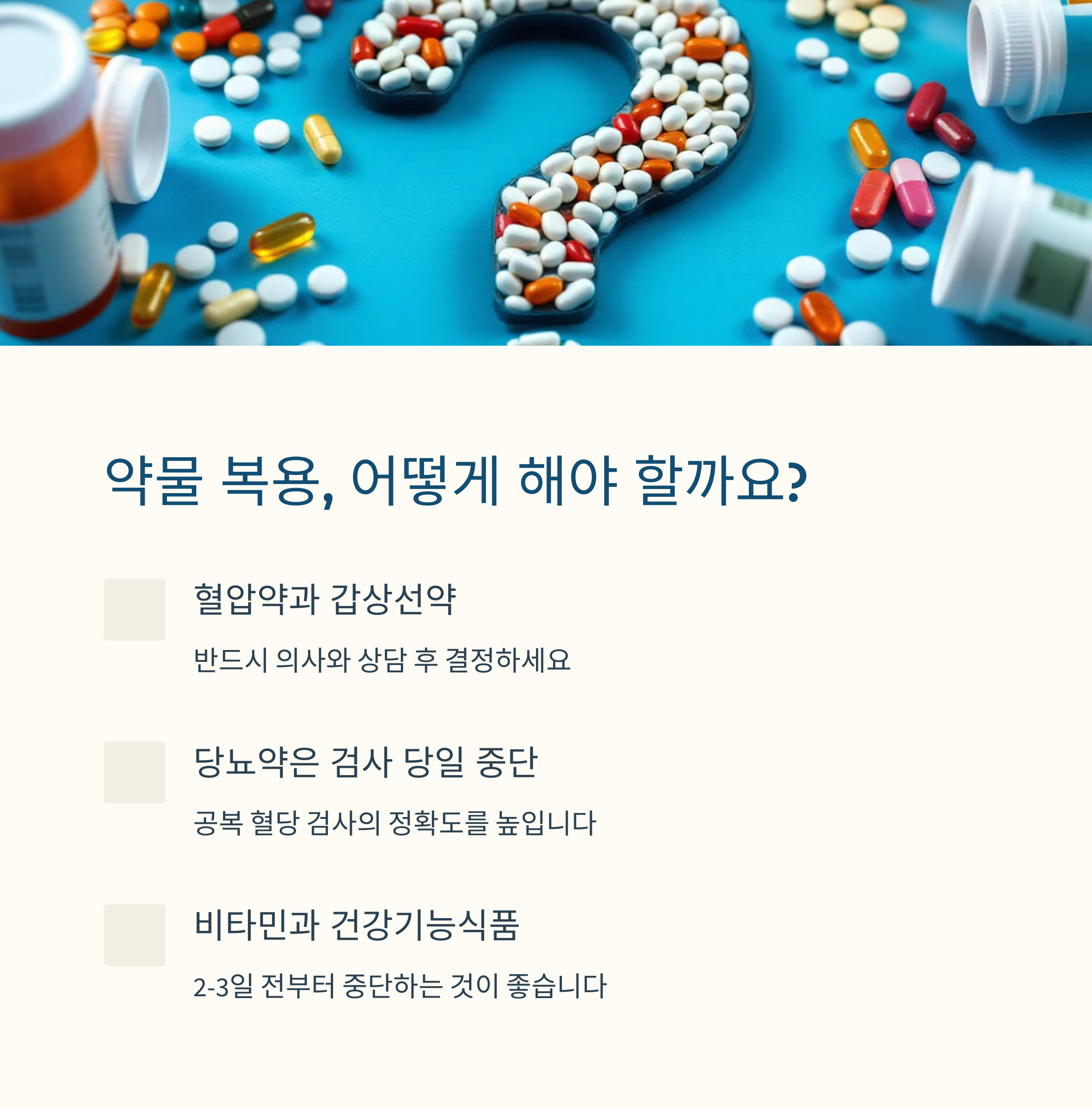 | 검사 정확도 향상에 도움 | 혈액검사 및 당 수치 정확도 확보 | 수치 왜곡 방지 목적 |
