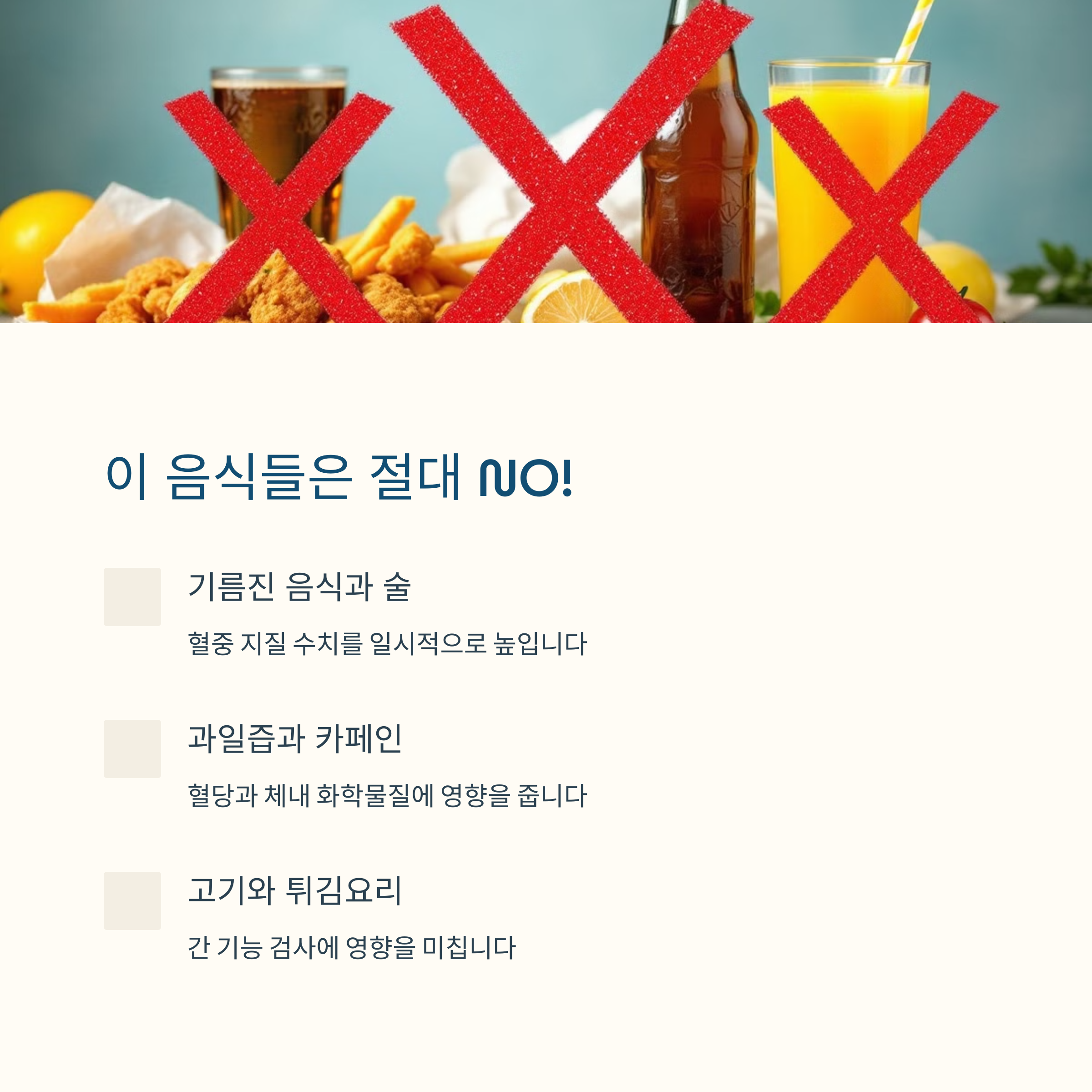 가장 많이 오해하는 부분 중 하나는 과일 주스나 건강기능식품은 괜찮을 것이라는 생각입니다. 하지만 과일 주스에는 과당이 많이 포함되어 있어 공복 혈당 수치를 높일 수 있으며, 일부 건강기능식품은 간 기능 수치에 영향을 줄 수 있습니다. 특히 전날 과식하거나 야식을 섭취하면 트리글리세라이드 수치가 급격히 높아질 수 있어, 의도치 않게 '비정상' 판정을 받을 수 있으니 주의가 필요합니다.