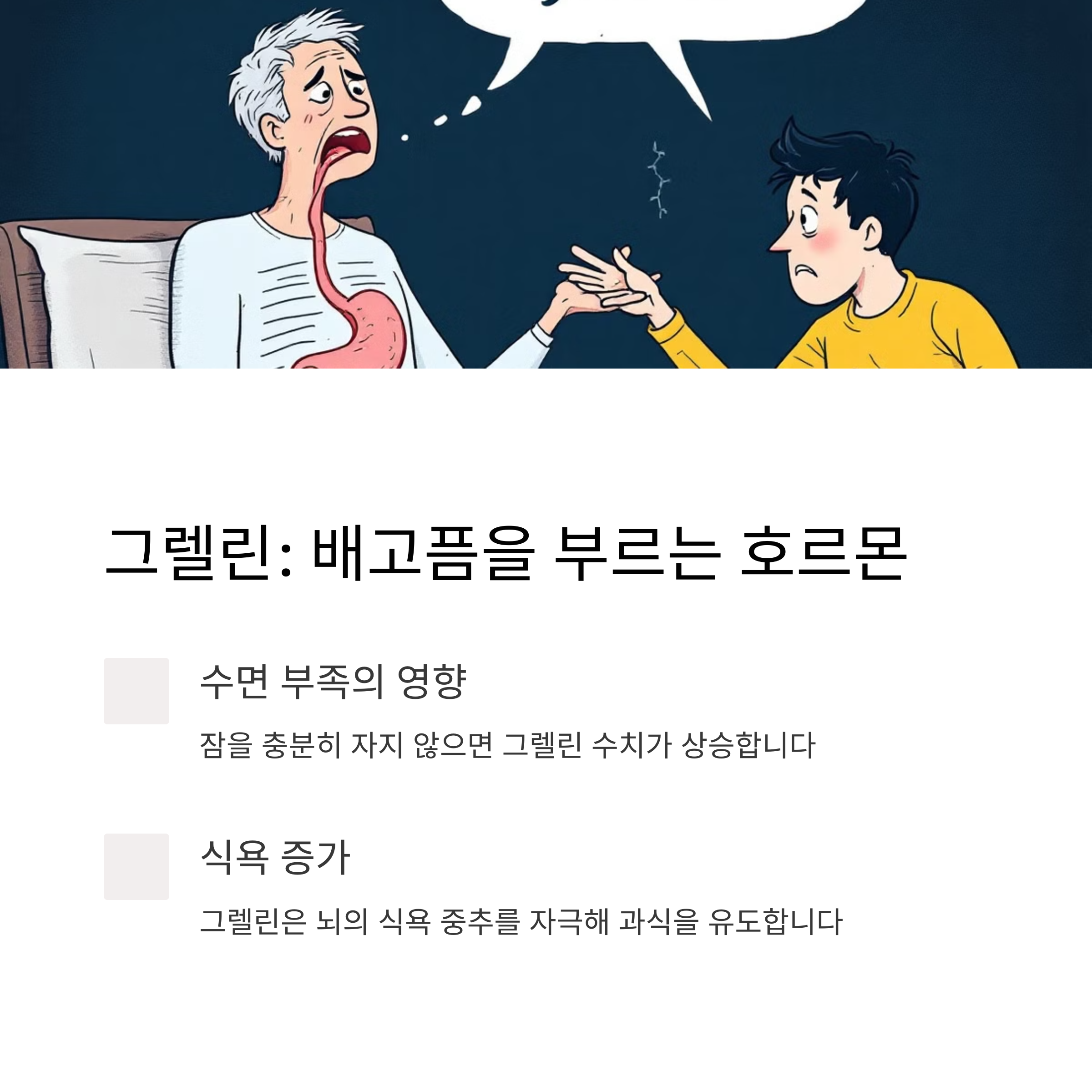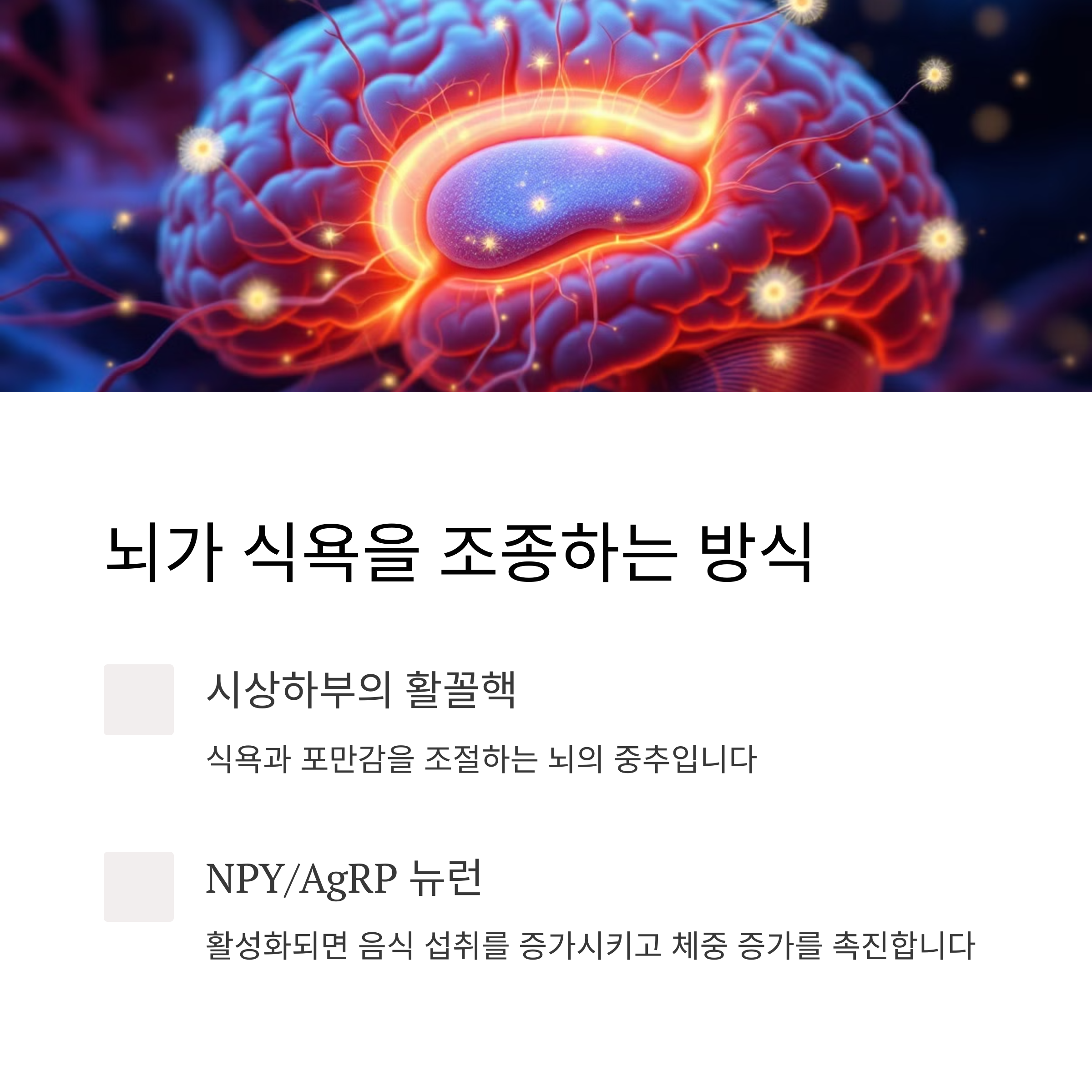 | 코르티솔 | 스트레스 시 분비되어 식욕을 자극하는 호르몬입니다. |
