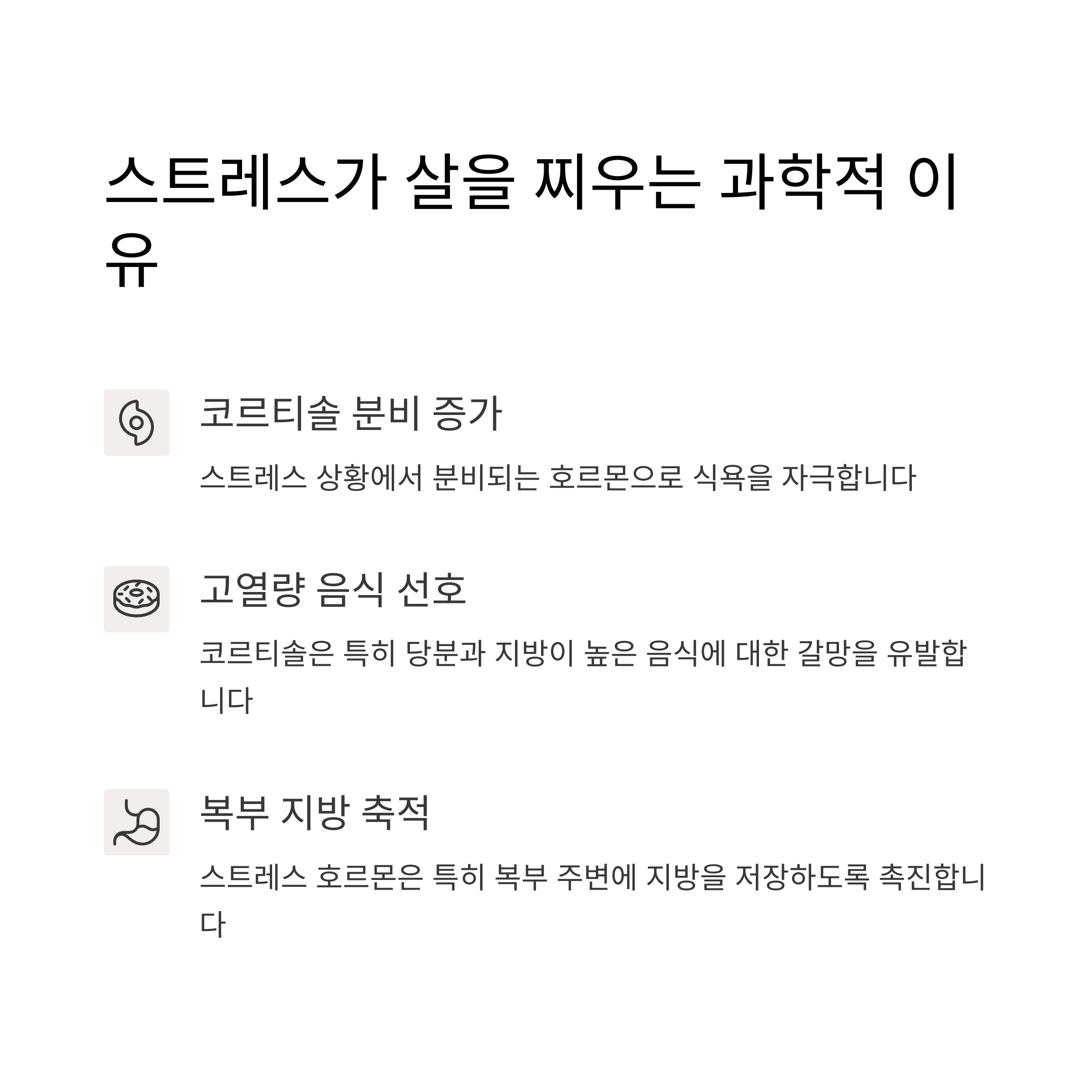 | 만성 스트레스는 식욕과 지방 축적을 유도합니다. | 스트레스로 인해 분비되는 주요 호르몬입니다. | 스트레스는 복부 지방을 중심으로 저장을 촉진합니다. |