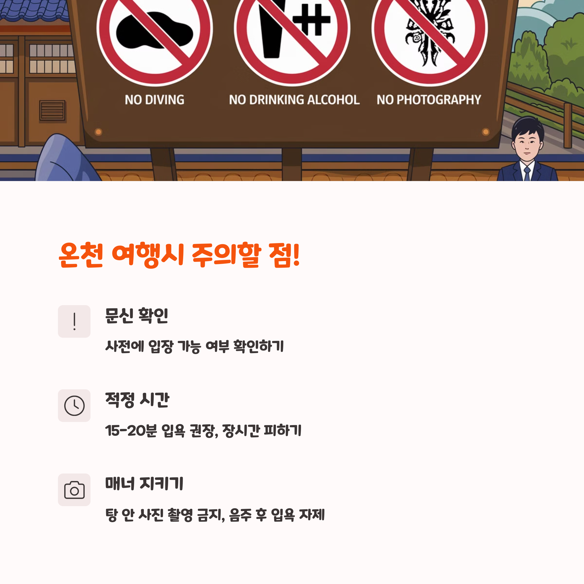| 온천 에티켓 | 탕에 들어가기 전 몸을 깨끗이 씻어야 합니다. |