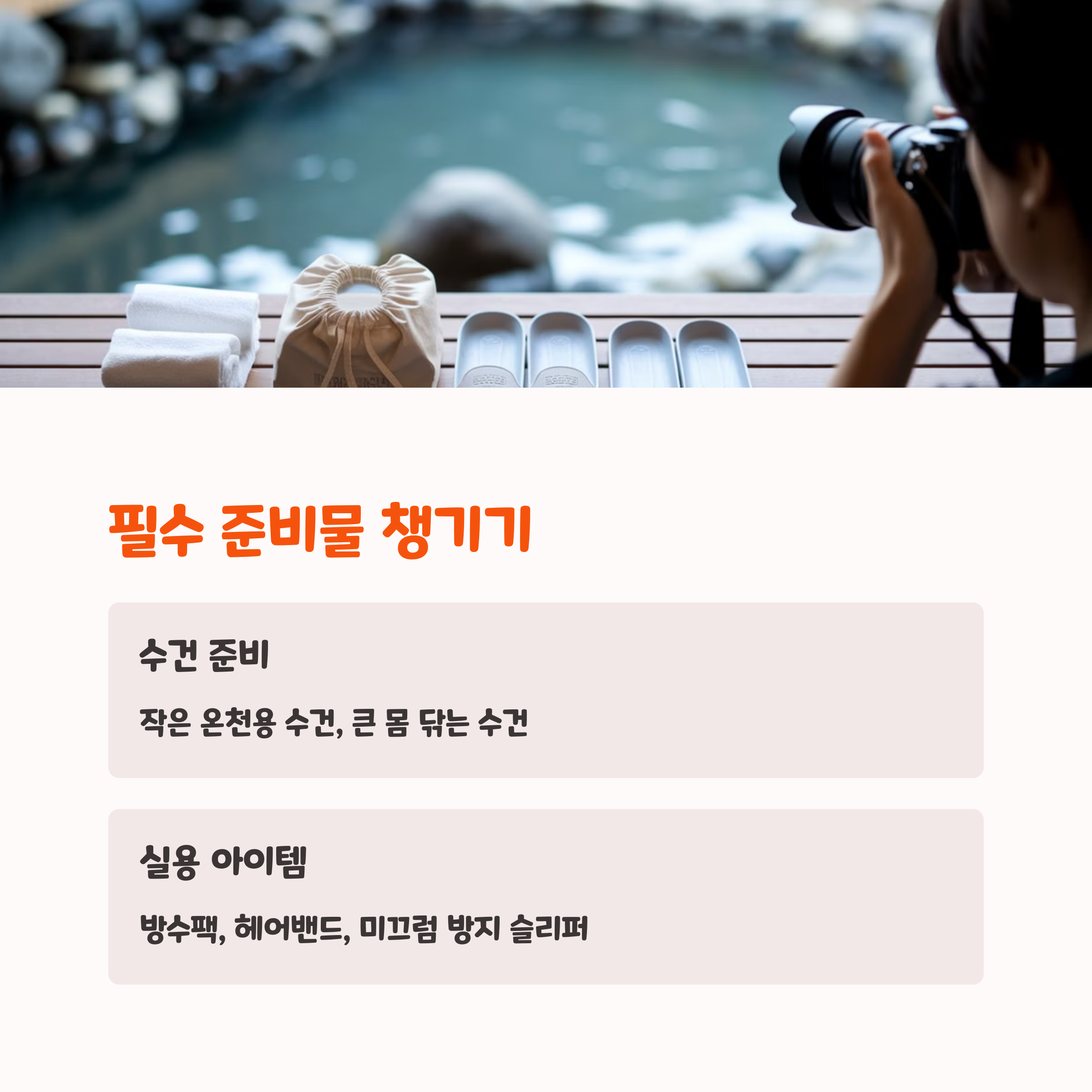 | 필수 준비물 | 개인 수건과 방수팩을 챙겨가면 편리합니다. |